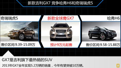 無(wú)論是市場(chǎng)需求還是產(chǎn)品競(jìng)爭(zhēng)力,GX7都是吉利銷(xiāo)量增長(zhǎng)最強(qiáng)勁的產(chǎn)品。待新款全球鷹GX7上市后,將與國(guó)內(nèi)SUV市場(chǎng)中熱銷(xiāo)的哈弗H6和奇瑞瑞虎5展開(kāi)競(jìng)爭(zhēng)。憑借出眾的配置和同級(jí)少有6AT變速箱,是新款全球鷹GX7的主要賣(mài)點(diǎn)。
