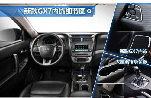 內(nèi)飾方面,新款GX7增加試下流行的鍍鉻元素,中控臺(tái)、方向盤(pán)、甚至儲(chǔ)物格隨處可見(jiàn)鍍鉻條裝飾,擺脫了現(xiàn)款沉悶的氣息,更顯高端氣質(zhì)。同時(shí),內(nèi)飾還增加個(gè) 多個(gè)儲(chǔ)物小格,設(shè)計(jì)更加人性化。配置方面,除2.4L+6AT車(chē)型,新款GX7 2.0L+6AT車(chē)型也增加了定速巡航系統(tǒng)。