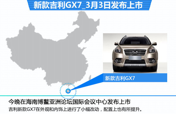 在去年吉利汽車銷量大幅增長,同時旗下在SUV板塊也有著井噴式發展,僅全球鷹GX7便貢獻了52,400輛,同比增長67.4%,占據企業全年銷量近10%的份額。日前網通社從吉利汽車官方獲悉,吉利旗下最熱銷的SUV將在今晚9時在海南博鰲亞洲論壇國際會議中心正式發布上市。我們在走訪多家吉利汽車經銷商后了解到,新款GX7目前已開始接受預訂,起售價在9萬元左右。