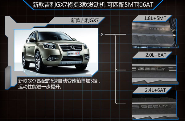 動力方面,新款GX7與現款保持不變,仍將搭載1.8L、2.0L和2.4L三款發動機,與發動機匹配的是5速手動或6速手自一體變速箱。值得一提的是新款GX7所匹配的6速自動變速箱增加S擋,運動性能進一步提升,同時還為駕駛員提供全新的駕駛樂趣。
