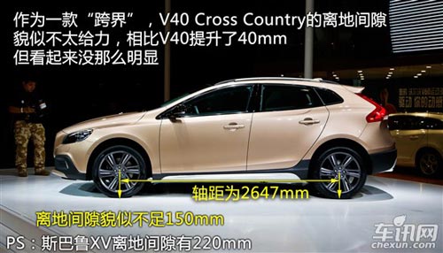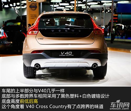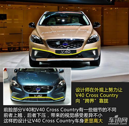 沃爾沃V40 Cross Country基于V40改進而來,定位跨界車。基于提高通過能力的設計思路,該車的離地高度相比V40增加了40mm。新車采用了全新設計的黑色保險杠、后保險杠、蜂窩狀前進氣格柵、經過改進的前大燈等配置,使新車看起來更具野性。
