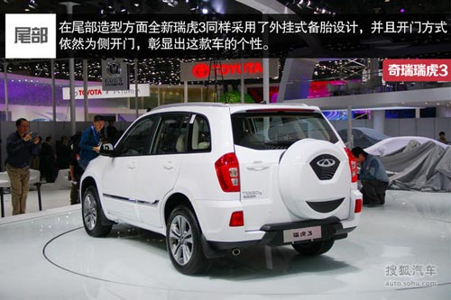 在尾部造型方面新款瑞虎3同樣采用了外掛式備胎設(shè)計(jì),并且開(kāi)門(mén)方式依然為側(cè)開(kāi)門(mén)式,彰顯出這款車(chē)的個(gè)性,牌照架的位置也由先前的左側(cè)位置調(diào)整至中間,尾部整體設(shè)計(jì)較為飽滿。
