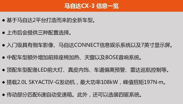 日前有消息稱,在去年的洛杉磯車展之上首發的馬自達全新小型SUV CX-3將于秋季在美國市場銷售。鑒于中國對SUV的巨大需求,CX-3在未來或許也會進入中國市場。