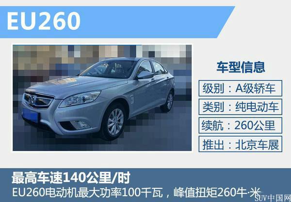 北汽EU260定位為緊湊型純電動車,基于紳寶D50打造,長寬高分別為4582*1794*1515毫米,軸距為2650毫米。動力方面,EU260搭載的永磁同步電機功率為100千瓦,電動機扭矩為260牛·米。其最高車速可達到140公里/每小時,0-100公里/時加速時間不到9秒,綜合工況續航里程為260公里。EU260采用的SmartCell智能電驅系統,可以確保車輛電池在半小時內充至80%。