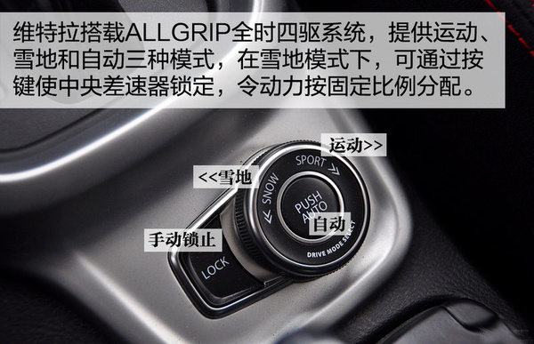 四驅功能方面,國產維特拉配備的是一套ALLGRIP全時四驅系統(tǒng),配備多片離合器式限滑差速器和開放式差速器。日常以前驅為主,而在車輛輪胎出現打滑時,電子輔助系統(tǒng)便會參與干涉,將部分動力轉移至后輪,以幫助車輛脫困。對于濕滑路面有著更佳的動態(tài)表現,并且也提供了前后50:50的動力鎖止功能。其次,全系標配了第九代博世ESP系統(tǒng),基本保障妥妥的。
