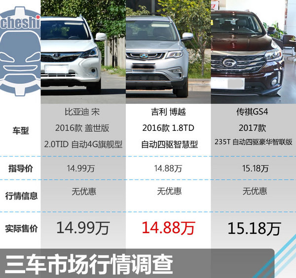 總結(jié):在三款車都沒(méi)有終端優(yōu)惠的時(shí)候,廠家重點(diǎn)補(bǔ)貼就是優(yōu)勢(shì),比亞迪元蓋世版和博越兩款車型都有一定的廠家補(bǔ)貼,從另一個(gè)角度來(lái)說(shuō),也算是優(yōu)惠,而這兩款車的優(yōu)勢(shì)除了配置高意外,還具備當(dāng)下流行的互聯(lián)功能,可以說(shuō)是不錯(cuò)的選擇,至于傳祺GS4則是一款口碑與銷量車型,如果沒(méi)有太多主意隨大流也是不錯(cuò)的選擇。