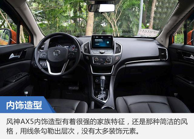風(fēng)神AX5內(nèi)飾造型有著很強的家族特征,還是那種簡潔風(fēng)格,用線條勾勒出層次,沒有太多裝飾元素。中控臺采用偏軟的搪塑,手感舒適,,接縫比較均勻,整體做工也非常不錯。三幅式方向盤采用真皮包裹,并且在三點和九點位設(shè)置貼合手型的凹槽,握感扎實。兩側(cè)的多功能鍵可以提供多媒體控制、藍牙電話和ACC巡航控制等功能。雙圓式表盤外圈采用鍍鉻包邊,黑底白字清晰易讀,也符合其定位。中央的彩色顯示屏,可以提供大量行車信息。中控臺頂部配置了一塊8英寸的顯示屏,屏幕的分辨率和反應(yīng)速度都還不錯,下方配備了物理按鍵的控制區(qū)。多媒體系統(tǒng)配備了WindLink車載智能互聯(lián)系統(tǒng),可以與安卓系統(tǒng)手機連接實現(xiàn)共享以及定位服務(wù)等功能。而且Telematics遠程技術(shù)信息服務(wù)支持離車導(dǎo)航,借助車機互聯(lián)功能將導(dǎo)航信息推送到用戶手機端。中高配車型配有360°全景影像,后方的輔助線可以可與方向盤隨動,使日常泊車安全性大幅度提升,如果攝像頭的清晰度能再高點就更好了。手動空調(diào)功能旋鈕與按鍵設(shè)計的整體布局都非常簡潔,并且使用起來的質(zhì)感與阻尼感方面也有著不錯的表現(xiàn),同時還配備了后排出風(fēng)口。中控臺底部設(shè)置了USB、AUX、SD卡槽和12V電源接口,方便外部設(shè)備的接駁。四門都配有電動升降車窗,并且都具備一鍵升降功能。