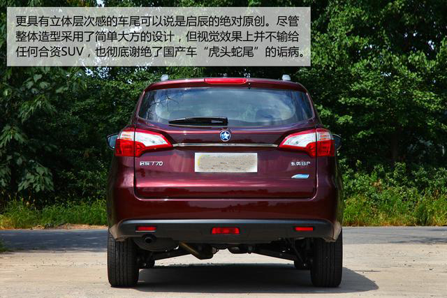 車身側(cè)面的整體造型屬于硬朗且陽剛風(fēng)格的設(shè)計,其中前輪翼子板右上角的個性化轉(zhuǎn)向燈、高亮鍍鉻車門把手和車頂行李架等都是能吸引國內(nèi)消費者的細節(jié)設(shè)計。同時新車的長寬高分別為4542mm/1786mm/1642mm,軸距為2630mm,內(nèi)部的駕乘空間比較寬裕。車尾的造型感覺要比前臉更吸引人,這也展現(xiàn)出了啟辰原創(chuàng)設(shè)計的實力和優(yōu)勢。盡管車尾的造型使用了簡單的設(shè)計元素,但層次感和科技感并不會輸于任何一輛同級別中合資SUV的車型,LED的高位剎車燈是全系的標配,尾燈組內(nèi)部的光源依舊是鹵素,但燈具表面類似光帶的設(shè)計提升了質(zhì)感。