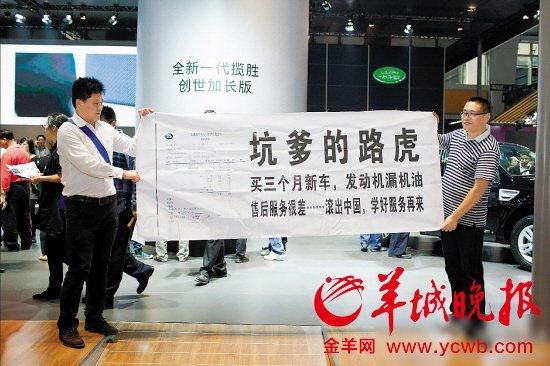 11月22日,兩名打著橫幅的男青年出現在路虎展臺上。標題為“坑爹的路虎”的橫幅引來圍觀。橫幅上寫著“買三個月新車,發動機漏機油,售后服務很差……滾出中國,學好服務再來”。很快這兩名男子便被幾個穿著制服的保安帶離。