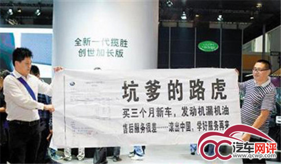 2013年廣州車展,2名男青年在捷豹路虎展臺拉出了“坑爹的路虎買三個(gè)月新車,發(fā)動(dòng)機(jī)漏油,售后服務(wù)很差……滾出中國,學(xué)好服務(wù)再來”的維權(quán)橫幅。