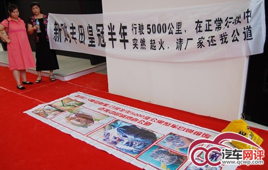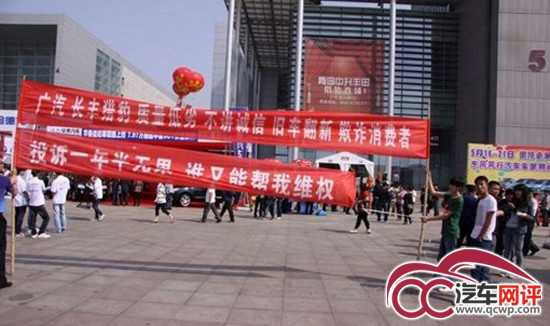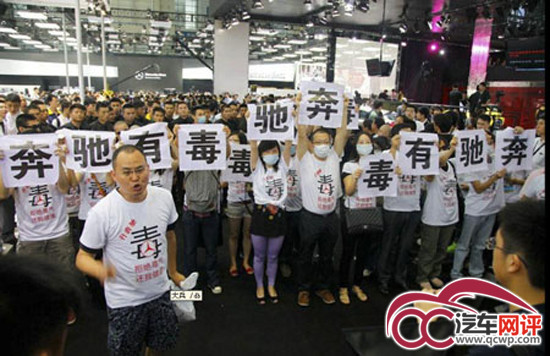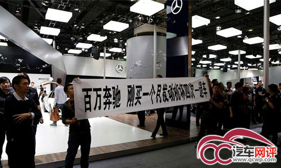 2012年廣州車展,奔馳車主手拉橫幅在奔馳展臺維權(quán)。