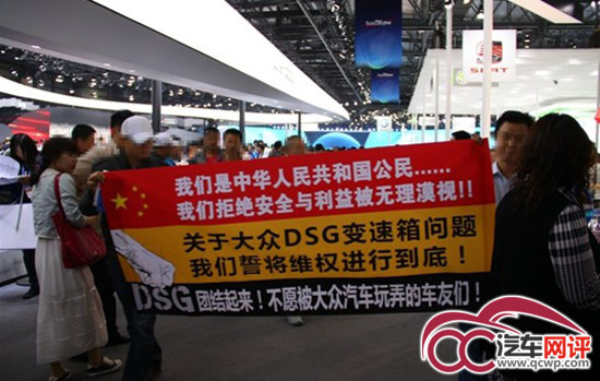 2012年北京車展,大批大眾車主舉著橫幅,來到大眾展臺進(jìn)行維權(quán)。