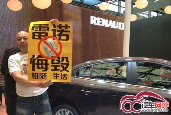 2012年京港澳車展,雷諾車主手持標(biāo)語在雷諾展臺維權(quán)。
