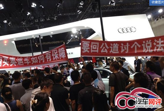 2012年成都國際車展,一群高舉橫幅的人來到奧迪展臺維權(quán)。