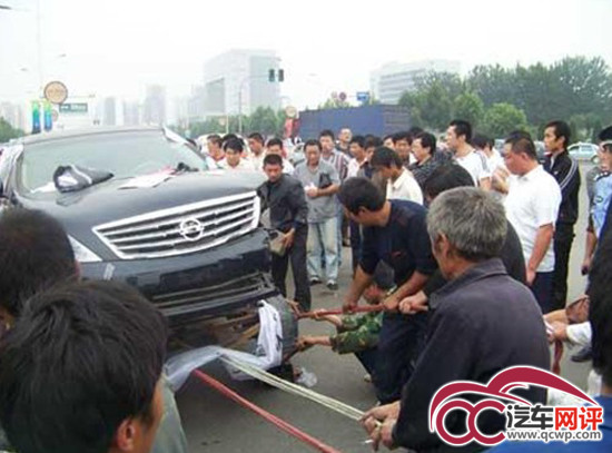 2009年濟(jì)南車展,維權(quán)車主雇傭十幾名民工手拉日產(chǎn)天籟轎車在展館外游行。