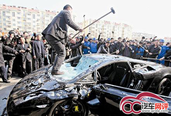 2012年青島車展,廣汽長豐獵豹、力帆520和蘭博基尼車主在展館外進(jìn)行維權(quán)。過激車主現(xiàn)場砸毀蘭博基尼蓋拉多跑車。
