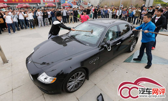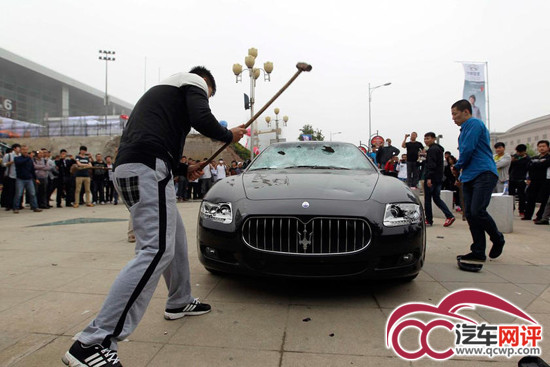 2013年青島車展,一男子因不滿瑪莎拉蒂經(jīng)銷商配件以次充好,現(xiàn)場砸毀價(jià)值260萬的瑪莎拉蒂總裁車型。