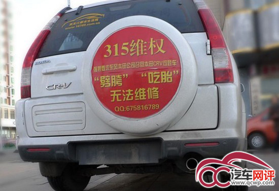 2011年哈爾濱車展,本田CRV車主將其貼滿標(biāo)語的問題車輛開到展館外。