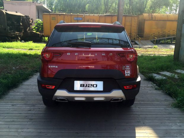 車尾部分,北京BJ20基本維持了展車的造型。新車后備廂蓋上增加了“BEIJING”字樣,同時下方的黑色區域也改為了亞光黑色。車尾下護板則與車頭部分呼應,采用亞光銀色噴涂,左右共兩出的排氣維持了展車的樣式。