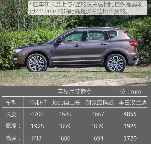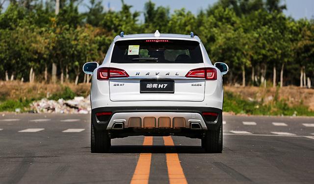 由于采用了5座設計,使得H7的后半部分顯得很緊湊,加之車門上的凹凸造型,看著還是很有力量感的,而1925mm的寬度和2850mm的軸距在中型五座SUV中,絕 對算得上是大塊頭了。此外,H7的最小離地間隙為199mm,通過角17°,接近角20°,較短的車尾讓它的離去角達到了28°。