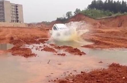 然后跟著又繼續進入到下一個水坑,可見越野性能真的不是吹,估計豐田霸道經過這水坑都熄火了。