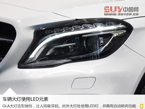 奔馳GLA在車輛前部引擎蓋處有所突起,整體感覺強悍有力,其進氣格柵采用雙條幅設計,與目前的奔馳C級、奔馳E級十分相似,同樣在中央位置嵌以碩大的盾標星徽,可以說這已經成為奔馳車型新的家族式設計理念。此外在大燈處,GLA與奔馳E級相同,同樣使用了LED日間行車燈,并且具有大燈自動轉向功能,這在日常使用中將非常實用