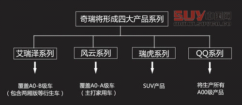 在確定回歸“一個奇瑞”品牌戰略后,奇瑞在產品層面也同樣做出了巨大的改變,“奇瑞汽車未來將逐步形成4大產品系列,分別為艾瑞澤、風云、瑞虎和QQ系列。”奇瑞汽車總經理助理兼銷售公司總經理黃華瓊先生介紹到。