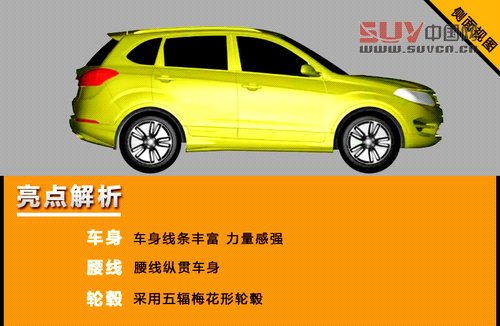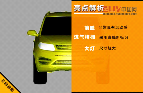 新車采用了全新的外觀設計,在前臉部分些許可以看見奇瑞新家族化的影子,進氣格柵與艾瑞澤相似,大燈尺寸較大符合SUV比較粗獷的特點,同時也使用了奇瑞新標志。新車車身側面線條犀利,腰線從前大燈一直延伸至尾燈,勾勒出來前后翼子板和側面線條,給人以力量感,從設計圖上看新車采用五輻梅花形輪轂且尺寸較大。