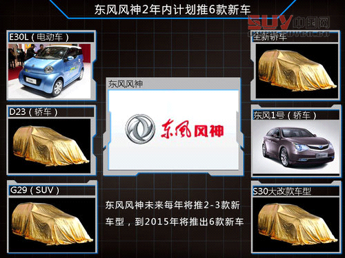 在東風(fēng)風(fēng)神發(fā)布的產(chǎn)品規(guī)劃中,其將在2014年的北京車展期間展出三款新車型,分別為E30L(純電動(dòng)車)、代號(hào)為D23轎車(定位在S30與A60之間)以及代號(hào)為G29的SUV車型。2015年其還將推出一款定位高于A60的轎車,此外一款內(nèi)部代號(hào)為東風(fēng)1號(hào)的旗艦車型也在研發(fā)中,該車基于PSA 3號(hào)平臺(tái)研發(fā),預(yù)計(jì)會(huì)在2015年年底推出,而現(xiàn)款S30的大改款車型其也在規(guī)劃中。