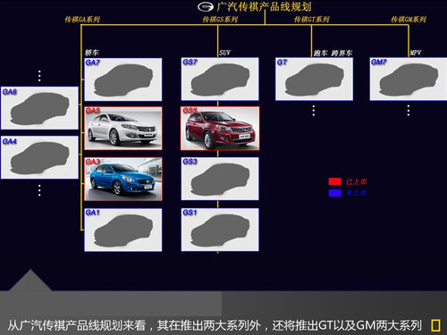 目前,廣汽傳祺旗下有GS5、GA3、GA5三款車型。從此前廣汽傳祺官方給出的新車規劃看,除了已推出的GA、GS系列外,未來還將推出GT以及GM兩大系列。在新車型上,廣汽傳祺將基于中大型平臺推出轎車、跨界、SUV以及MPV車型。吳松表示:下一步將推出軸距為2900mm的C級車。而小型車方面將推出包括A0級車型在內的多款與GA3同平臺的A級車。值得一提的是從A0級到C級平臺,廣汽傳祺都將自己獨立打造。