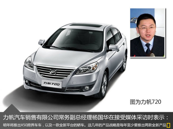 2013年10月,力帆汽車于西藏齊發三款全新車型,分別為330、530、630三款轎車,而根據其品牌規劃,力帆還將于明年推出兩款全新車型。對此,力帆汽車銷售有限公司常務副總經理楊國華在接受媒體采訪時表示:“明年有一款X50的跨界車將推出,另外還有一款基于全新平臺打造的轎車820,也是明年會推出。總體來講,按照目前力帆的規劃來說,就是每年至少要推出兩款全新的產品。”