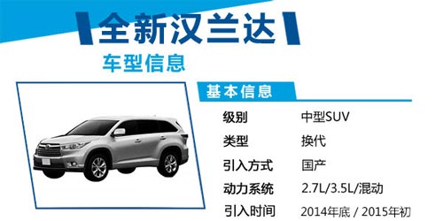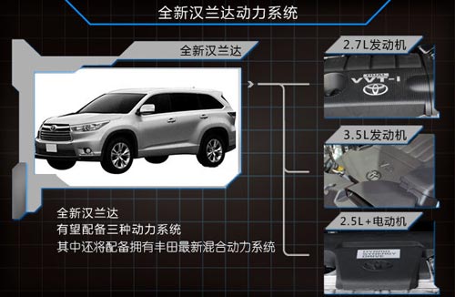 作為豐田旗下的熱銷車型,漢蘭達在2013年占據(jù)了廣汽豐田整體銷量的30%左右份額,該款車型也將于2014年底2015年初迎來其換代車型,新款車型的的推出將有望進一步推進豐田在中型SUV領(lǐng)域競爭力。新車將帶來三款動力總成系統(tǒng),其中值得一提的是,混動版本漢蘭達也將同步引入國內(nèi)上市銷售供消費者選擇。