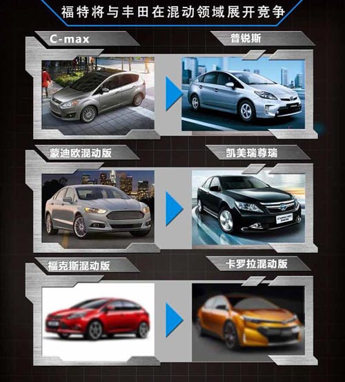 豐田作為國內涉足新能源領域較早的車企之一,目前在國內已經推出了凱美瑞尊瑞(B級轎車)、普銳斯(A級轎車)兩款混合動力車型,其還計劃在2015年推出一款定位A級混動轎車—卡羅拉。根據未來福特混動產品陣容的不斷豐富,其將在這一領域與豐田等品牌展開競爭。