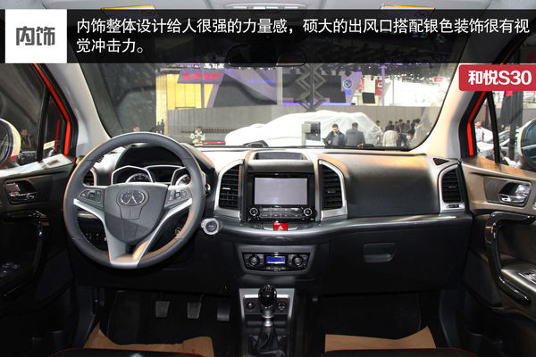 和悅S30內飾以黑色為主調,配以銀灰色內飾條,顯得質感十足。中控臺層次分明,裝有大尺寸顯示屏,清爽靚麗,彰顯商務品質。配置方面,新車全系標配發動機電子防盜、車內中控鎖、倒車雷達、行車電腦、AUX-IN接口、后視鏡電動調節、自動防眩目后視鏡、后雨刷。頂配車型將配有,無鑰匙進入及一鍵啟動、電動天窗、倒車影像、藍牙車載電話連接等配置。