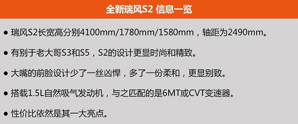 江淮瑞風(fēng)系列的SUV在國內(nèi)一直有不錯的銷量數(shù)字,如今,趁著國內(nèi)SUV風(fēng)潮勁吹,瑞風(fēng)順勢發(fā)布了旗下的小型SUV,瑞風(fēng)S2。瑞風(fēng)S2配備了1.5L自然吸氣發(fā)動機(jī),與之匹配的是6MT和CVT變速器