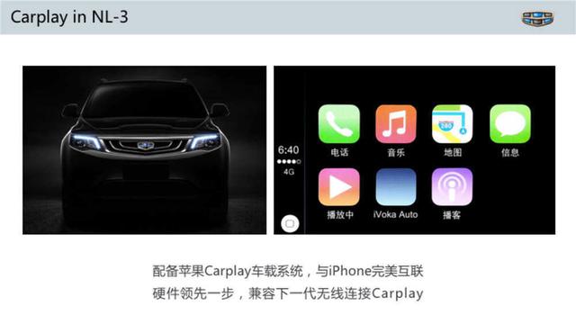車輛內部,吉利博越配備有多功能方向盤、中控臺觸摸屏、雙溫區自動空調、定速巡航、一鍵啟動系統等配置,而且從圖片上可以看出,整個內飾的設計也是相當時尚的。同時新車還采用了吉利全新一代車載信息互聯系統,并且兼容由蘋果公司開發的CarPlay,此系統可以完美的兼容蘋果手機,并且用戶可以通過中控大屏來操作手機中的相關APP,如撥打電話、發送短信、播放音樂、蘋果地圖導航等等。