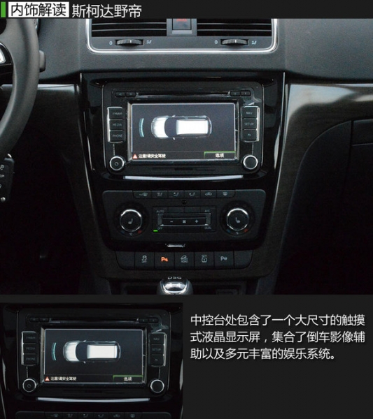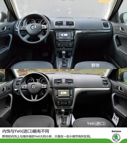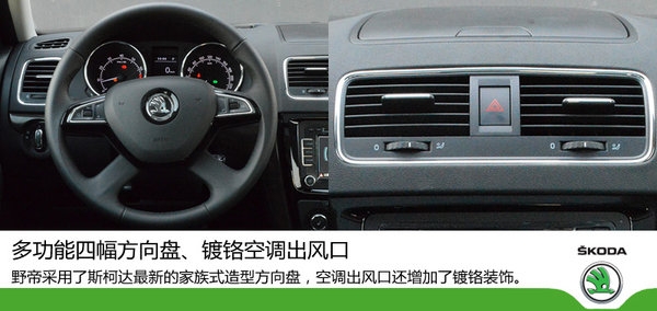 在內(nèi)飾方面,野帝與海外版Yeti大同小異,只是在一些小細(xì)節(jié)有所區(qū)別。其中最大的不同當(dāng)屬全新多功能四幅方向盤(pán),其采用了斯柯達(dá)最新的造型,中間的標(biāo)識(shí)也采用了最新設(shè)計(jì),增加了方向盤(pán)的立體感。并且方向盤(pán)在3點(diǎn)和9點(diǎn)位置設(shè)計(jì)有貼合拇指的凹槽,握感較好。另外,野帝的空調(diào)出風(fēng)口還根據(jù)國(guó)內(nèi)消費(fèi)者的喜好增加了鍍鉻裝飾,與進(jìn)氣格柵的鍍鉻裝飾例外呼應(yīng)。但野帝的中控臺(tái)不是很軟,采用的都是硬質(zhì)材料,這方面就不如海外版的Yeti啦。