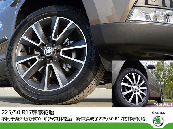 車(chē)身依舊同進(jìn)口版造型一致,還是延續(xù)并體現(xiàn)著其個(gè)性化的設(shè)計(jì)。車(chē)頂銀色行李架對(duì)于SUV車(chē)型來(lái)說(shuō)是一個(gè)不可或缺的配置,既實(shí)用又能起到很好的裝飾作用。車(chē)側(cè)防擦條還增加了帶有“YETI”字樣的點(diǎn)綴,使得車(chē)身兩側(cè)不再單調(diào)。另外野帝與海外版Yeti一樣,同樣提供了6種不同樣式的輪轂供消費(fèi)者選擇,黑底銀邊的雙五輻式輪轂與黑色的側(cè)裙相得益彰。不同于海外版新款Yeti的米其林輪胎,野帝換成了韓泰輪胎,性?xún)r(jià)比較高,尺寸上還是一樣的225/50 R17。