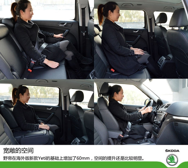 乘坐感受方面,后排腿部空間的表現(xiàn)也是野帝有別于海外版Yeti的一大優(yōu)勢(shì)。為了迎合國(guó)內(nèi)消費(fèi)者對(duì)于空間方面的需求,野帝在海外版新款Yeti的基礎(chǔ)上增加了60mm,空間的提升還是比較明顯。身高162mm的小編不管在在駕駛位還是后排座位,均活動(dòng)自如,車(chē)內(nèi)空間寬敞。