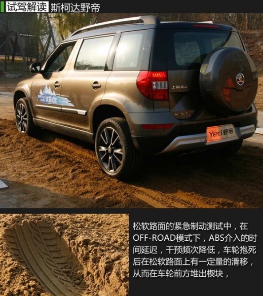 最后又進(jìn)行了在松軟路面的緊急制動(dòng)測(cè)試。搭配了ABS系統(tǒng)的普通車(chē)輛會(huì)因?yàn)樗绍浡访娓街^(guò)低,頻繁點(diǎn)剎車(chē)反而不利于松軟路面車(chē)輛制動(dòng)。而在野帝OFF-ROAD模式下,ABS介入的時(shí)間延遲同時(shí)干預(yù)頻次降低,車(chē)輪抱死后在松軟路面上有一定量的滑移,從而在車(chē)輪前方堆出楔塊,通過(guò)楔塊對(duì)車(chē)輪的阻力來(lái)縮短制動(dòng)距離。