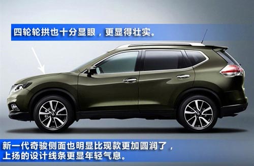 車身側面,新一代奇駿也明顯比現款更加圓潤了,上揚的設計線條更顯年輕氣息。但是,豎直的D柱設計則依舊被保留了下來,這明顯將帶來較好的后排乘坐空間。另外,四輪輪拱也十分顯眼,更顯得壯實。輪轂方面,全新奇駿搭載了19寸五輻輪轂設計,造型亦變得十分年輕化了。