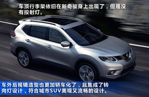 車外后視鏡造型也更加轎車化了,且集成了轉向燈設計,符合城市SUV美觀又流暢的設計。車頂行李架依舊在新奇駿身上出現了,但是沒有投射燈,城市SUV需要這個么?當然不需要!