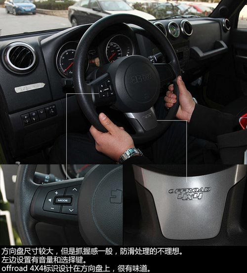 內(nèi)飾的設(shè)計基本上就告別了居家風格,中控臺部分設(shè)計圓中帶方,基本上就與女性車主告別了,我的意思就是高大威猛點的男士更適合來駕馭它。方向盤比較大,抓握感一般,對于出汗時候手容易打滑的處理不是很好,建議在增加摩擦力方面做一些改進。