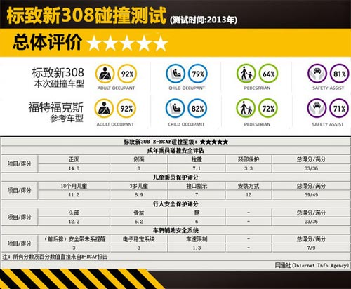標致新308的最終評定碰撞星級為最高的5星,從總成績來看,與同樣達到5星標準的福特福克斯不相上下。兩車在成年乘員安全測試上成績一致;在車輛輔助安全測試上因新308配置了車速限制系統和后排安全帶未系提醒所以得分高于福克斯;而在兒童安全和行人安全兩項安全測試上福克斯的成績則優于新308。