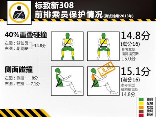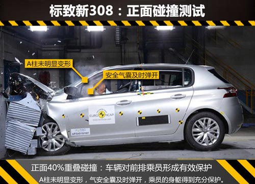 在正面的碰撞測試中,標致新308的發動機艙吸收了大部分能量,所以碰撞后A柱未明顯變形,駕駛員生存空間基本保持完整。安全氣囊及時彈開,充分保護了駕駛員和乘客的頭部,同時車內人員身體其他部位也受到了良好保護。此項測試滿分為16分,兩車成績差異不大,新308為15.1分,福克斯為15.9分。