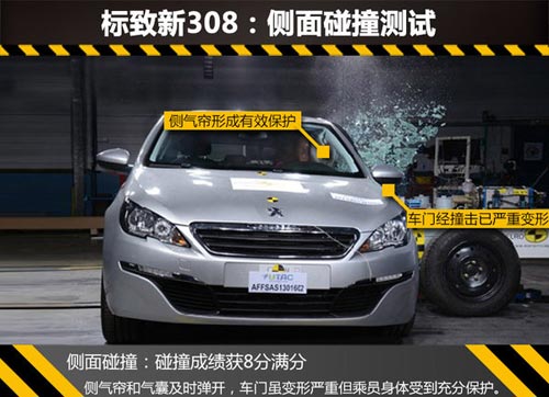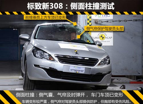 全新的標致308作為PSA集團的支柱車型有望于2014年底在神龍第三工廠進行投產。這款新車的安全性能受到眾多汽車消費者的關注。恰逢新標致308近日在歐洲做了碰撞測試并公布成績,網通社發現此車在側面柱撞中對駕駛員的保護仍需加強,現在我們就帶大家去看看這款新產品的測試情況。(本文數據來自E-NCAP)