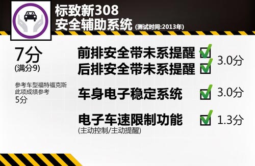 在車輛的輔助安全技術評估環節中,車速限制、ESP車身穩定系統以及安全帶未系提示都是其評估項目,每項裝配技術都將決定最終分值的高低。標致新308全部配備了以上安全輔助系統,并且達到了測試要求。而福克斯僅前排具有安全帶未系提示,后排座椅卻沒有,并且此車也沒有裝備電子車速限制系統。車輛安全輔助系統測試滿分為9分,新308成績為7分,比福克斯高2分。