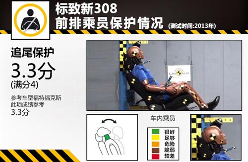 在模擬追尾碰撞時對車內乘員頸部保護的測試中,新308和福克斯的座椅和頭枕可以在追尾碰撞事故時為乘員提供良好的保護,避免頸椎過度屈伸的損傷。此項測試成績滿分為4分,兩車成績均為3.3分。