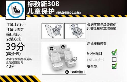 兒童安全保護也是評定一款車型的安全標準之一,在正面碰撞中,模擬3周歲兒童的假人頸部有受傷風險,新308對兒童的保護仍需加強。側面碰撞中,兒童座椅中的18個月和3周歲模擬假人都受到良好保護。在兒童座椅安全接口提示和安裝方式方面,新車在后排座椅提供了兩個ISOFIX接口,所處位置操作均較為方便,而在安裝指示的各種標識也非常清晰。新308副駕駛安全氣囊也可以關閉,以便允許在座位上使用背向式兒童安全座椅,并且能為駕駛員提供清晰的信息指示。此項測試成績滿分為49分,新308和福克斯的成績分別為39分和40分。