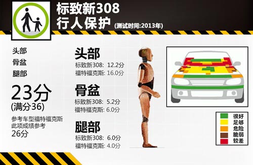 在行人保護測試中,新308的保險杠對行人腿部的保護比較到位,腿部保護取得了6分滿分,福克斯只拿到4分。新308發動機罩的大部分區域對行人骨盆保護還是足夠的,這項測試兩車成績分別為5.2分和6分。而A柱下端以及風擋下端區域在碰撞中卻可能會對行人頭部造成一定的傷害風險,頭部保護成績新308比福克斯低了近4分。